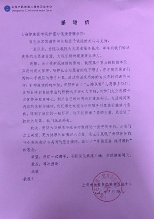 第二精神卫生中心对此特意写了一封感谢信,表达了公司志愿者长期以来对第二精神卫生中心志愿者服务的感谢,同时表达了对今后不断深化共建内涵,共建美好明天的期许。信中还表示,这展现了公司良好的社会责任意识与高尚的服务情怀,践行了“厚德至善、健行康民”的理念。