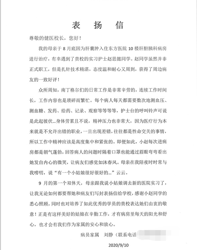 病员家属在信中提到:我的母亲(病人)时常在我耳边唠叨说有一个小姑娘很好很好……没错,这个小姑娘就是赵思懿。病员家属的语句中透露着亲昵与感激,在信的一开始就夸奖她“扎针技术精湛”,“态度温和耐心又周到”等等。