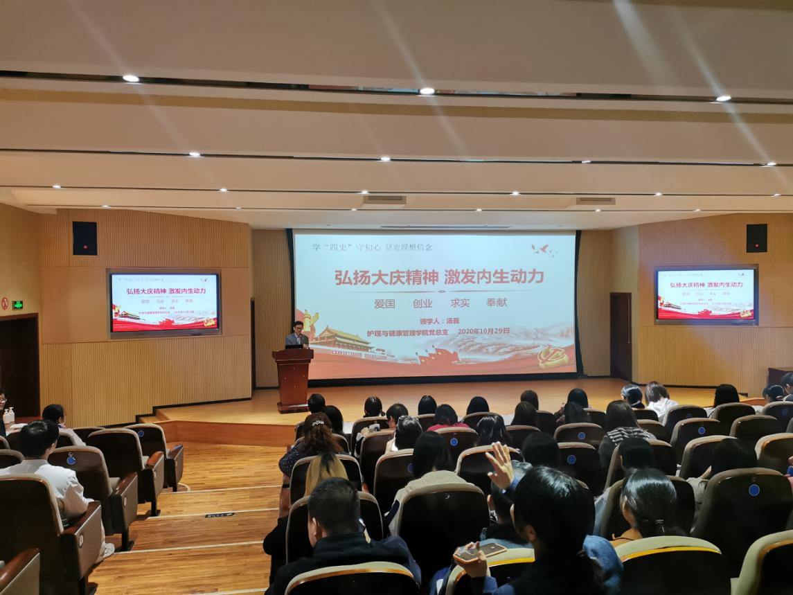 10月29日下午,在北苑200人报告厅,公司党总支举办了“弘扬大庆精神,激发内生动力”“四史”学习报告会,由公司党总支书记汤磊领学,全院师生党员和新生代表参加了此次学习。