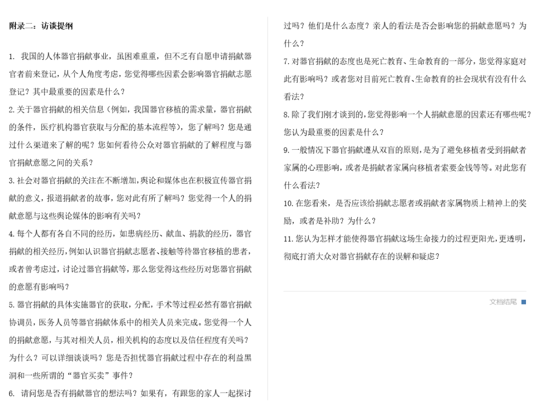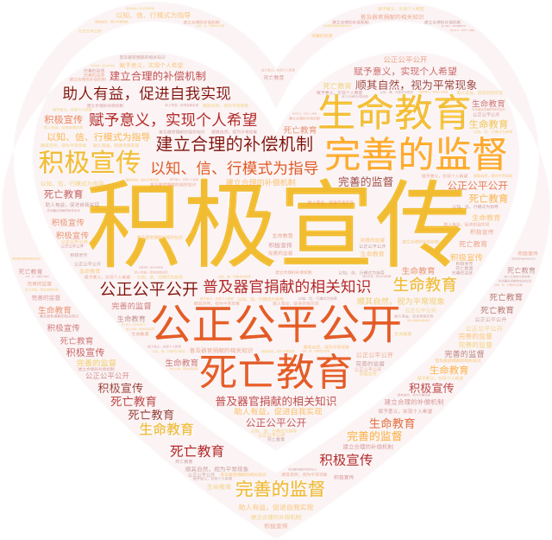 最后结合量性问卷调查与质性访谈结果分析,包括年龄、文化程度、区域差异、器官捐献程序不了解、家属不同意、对相关机构不信任、对捐献途径不了解及传统观念的影响等因素,多层次,多维度,有针对性地综合考量提出一份建议案,探索行之有效的器官捐献知识普及方式。