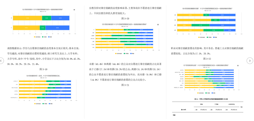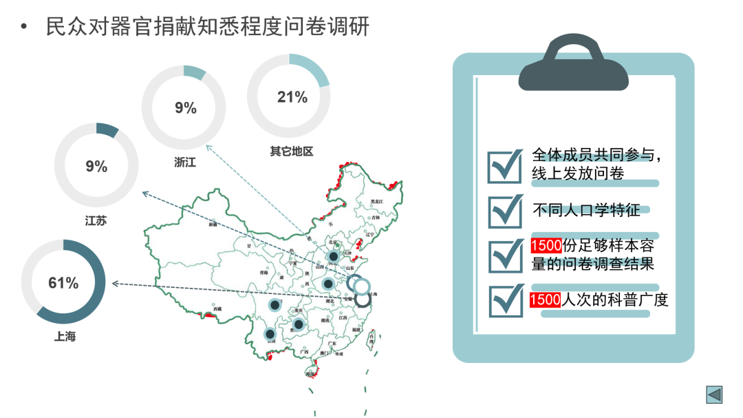 我们通过公众的器官捐献知悉程度问卷调研,深刻分析中国社会公民对于器官捐献的了解程度、意愿及误区等知识,分析不同人群的态度认知以及差异需求,做得到相关数据的同时,也对“器官捐献”的相关知识进行了宣传和为后期项目进展制定重点任务、提供数据支持。