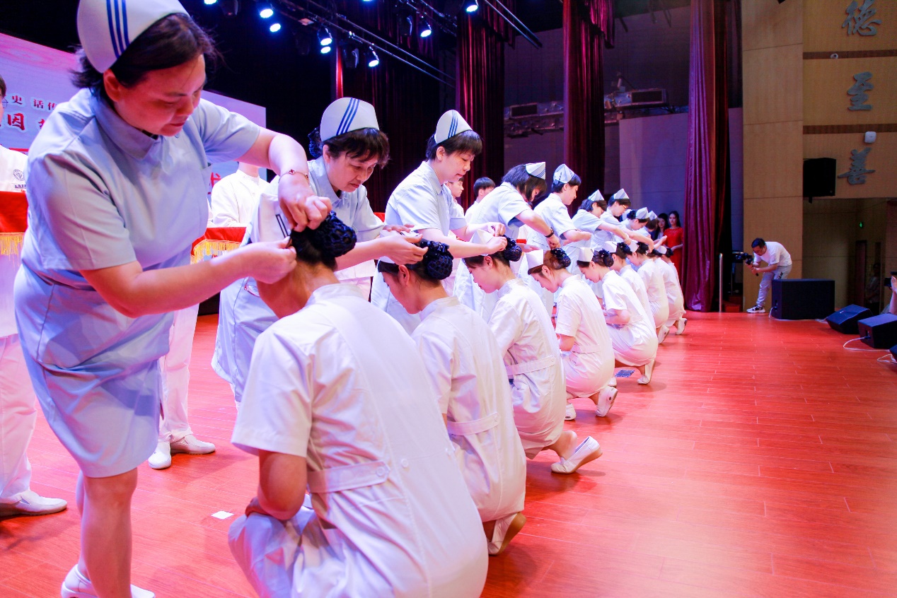 接着,由上海市护理学会副理事长庹炎、复旦大学附属中山医院护理部副主任秦薇、上海交大医学院附属仁济医院护理部副主任陈敏、复旦大学附属华山医院护理部副主任任学芳、上海交大医学院附属第六人民医院护理部副主任董芳辉、同济大学附属东方医院护理部主任张伟英、复旦大学附属上海市第五人民医院护理部主任顾艳荭、上海交通大学医学院附属国际和平妇幼保健院护理部主任李红、上海市精神卫生中心原护理部主任曹新妹、上海市浦东新区周浦医院护理部主任汤培凤共同为即将走上实习岗位的400多名护生代表授帽。