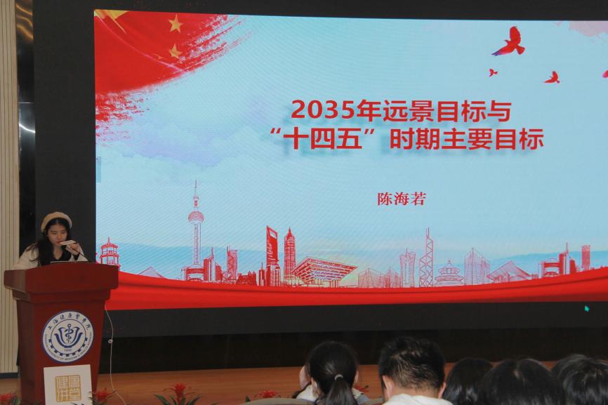 2021年11月15号17:00在北苑200人报告厅开展了健康讲堂的主题活动,本学院有幸邀请到了复旦大学马克思主义学院年轻讲师陈海若为我们深入宣讲五中全会有关内容--《2035远景目标和“十四五”时期主要目标》。