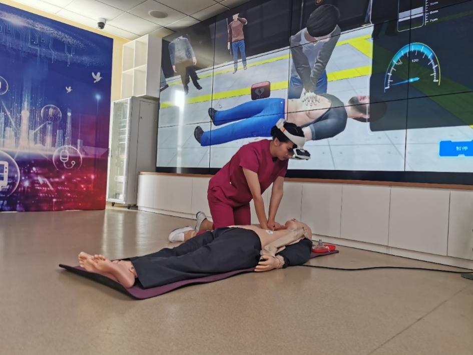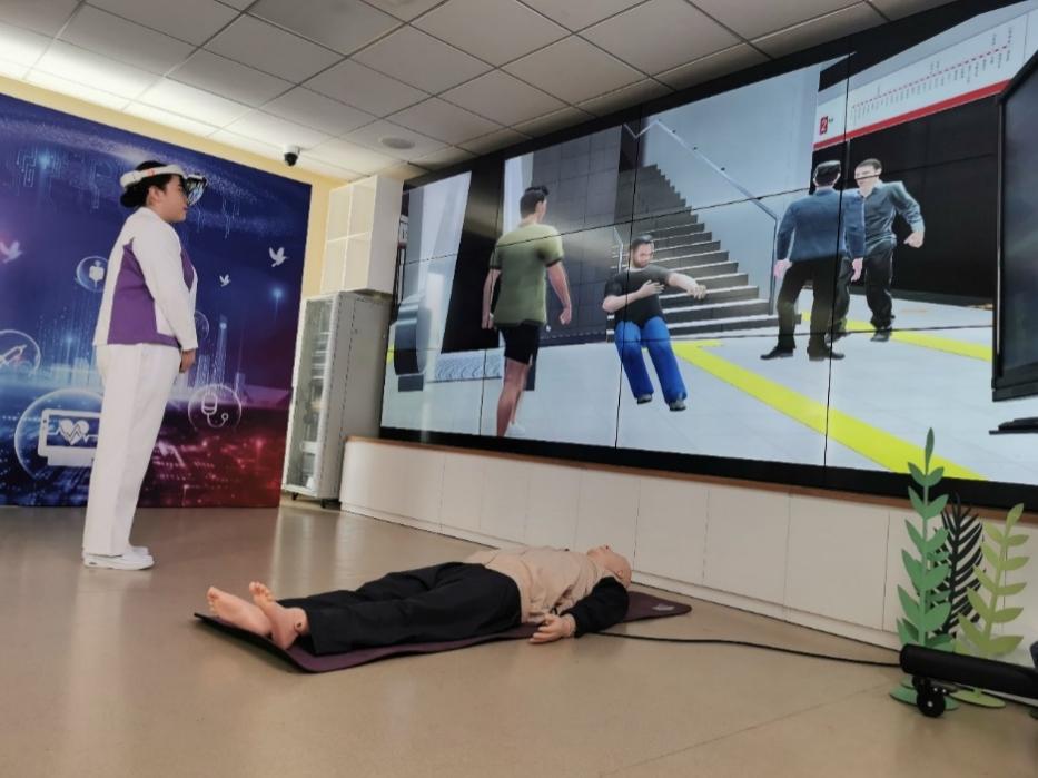 和往届大赛不同,本次大赛增设了个人赛项。应用混合现实急救评价系统,选手佩戴MR(混合现实)头盔,进入到一个沉浸式虚拟急救场景,在对虚拟病人进行评估后,实施心肺复苏操作,系统内置的AI评价系统给出是否抢救成功的判断。这种虚实结合的方式,让选手在近乎真实的环境中展开急救操作,突显数字化、信息化的护理实训效果和应用趋势。